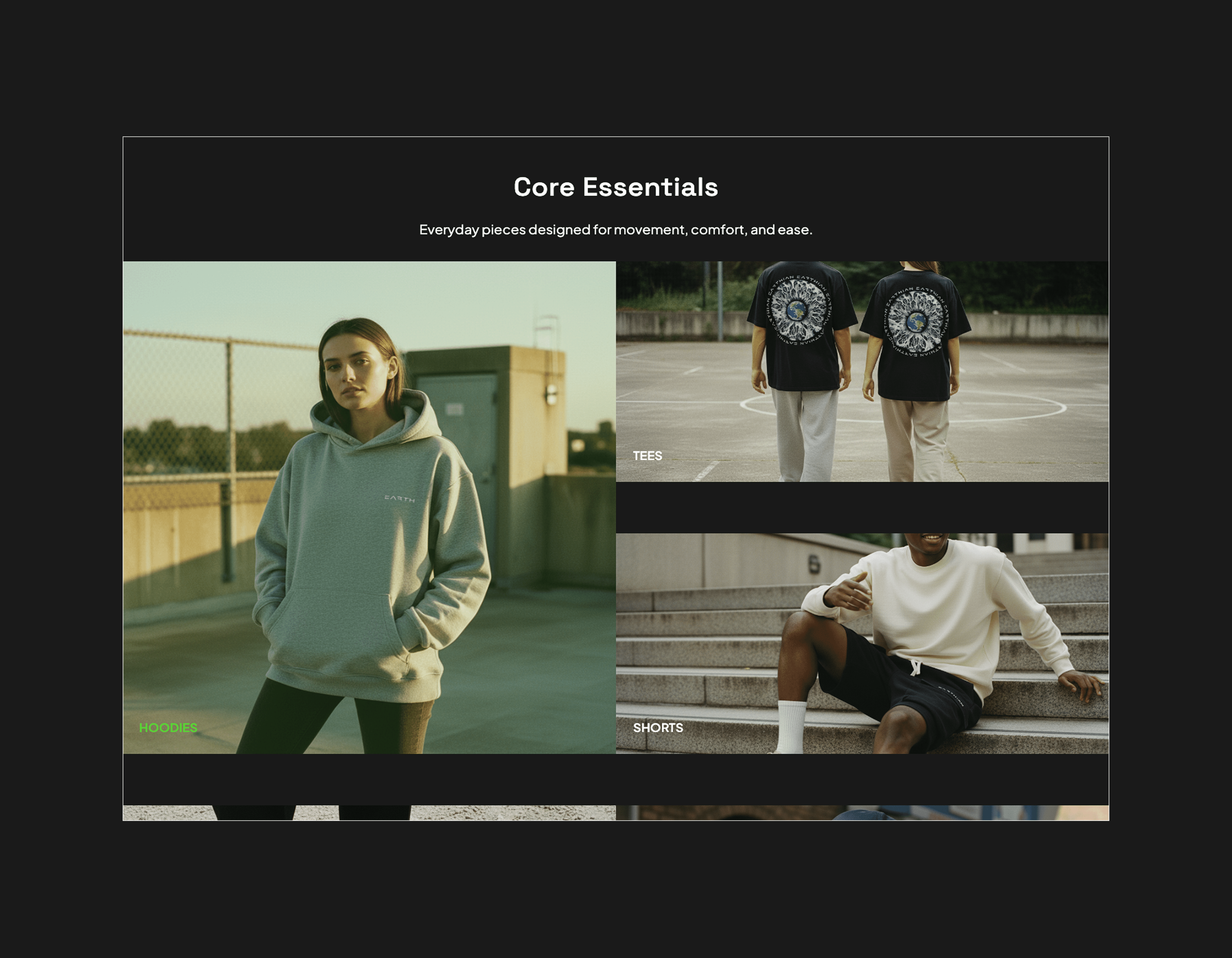 For Earthian, I proposed a visual direction focused on refining the brand’s typography, color system, and imagery for their website. The approach emphasizes clarity and restraint—using neutral tones as a foundation while reserving Earthian’s signature green for interactive moments. Imagery was thoughtfully crafted to strengthen the brand’s storytelling, helping communicate its earth-inspired, movement-driven identity through a more cohesive and intentional digital experience.